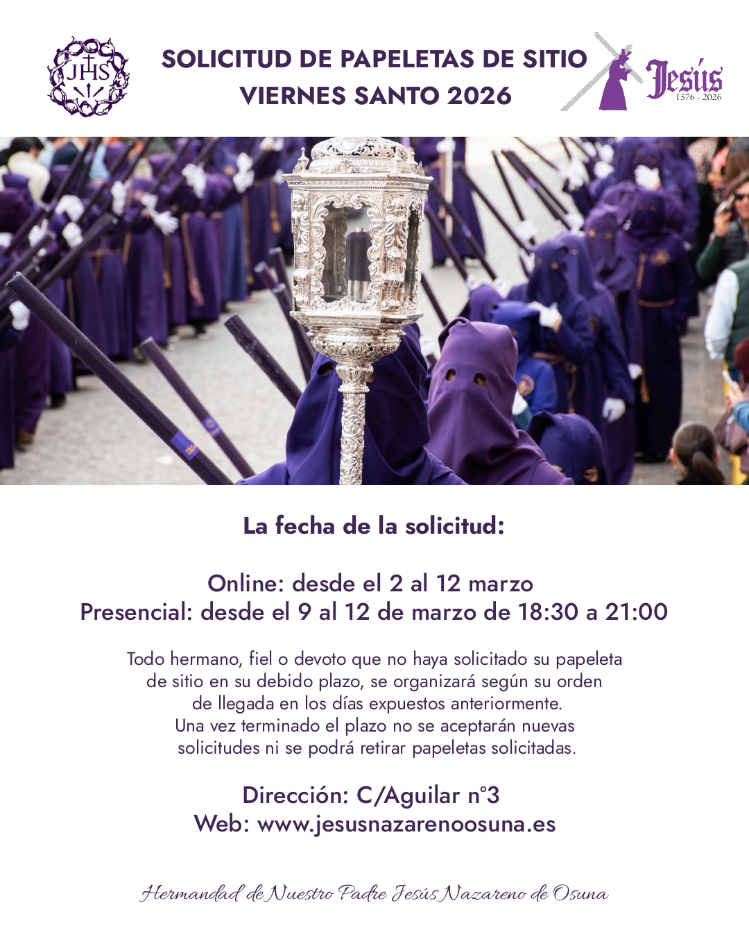 Todos los hermanos que deseen realizar Estación de Penitencia acompañando a nuestro Sagrado Titular, deberán solicitarlo a través de la página web del 2 al 12 de marzo del presente año.