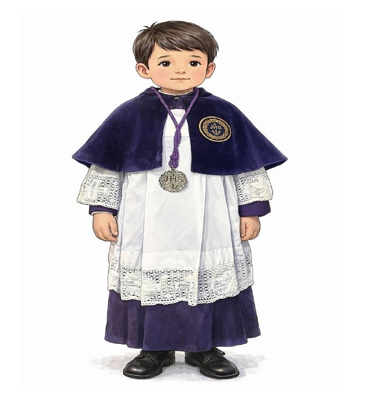 1. El hábito será túnica morada, guantes blancos, calcetines y zapatos oscuro. Encima de la túnica llevarán roquete blanco y capa de terciopelo morada. Cada uno llevará su propia canastilla.