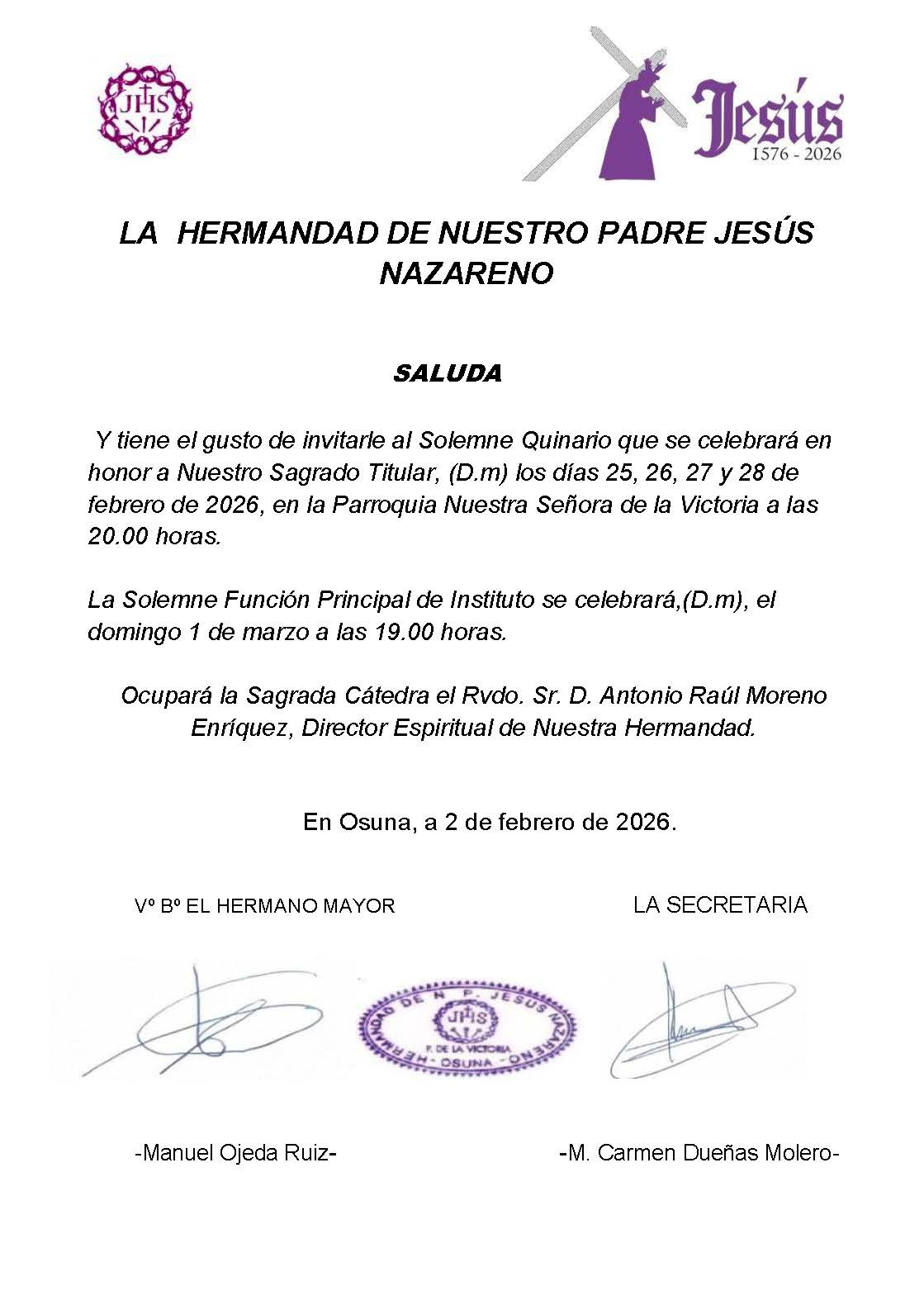 De igual modo, podrán realizarlo de forma presencial en la Casa Hermandad, sita en Calle Aguilar 3-A, presentando el modelo adjunto, en las fechas que se indican a continuación