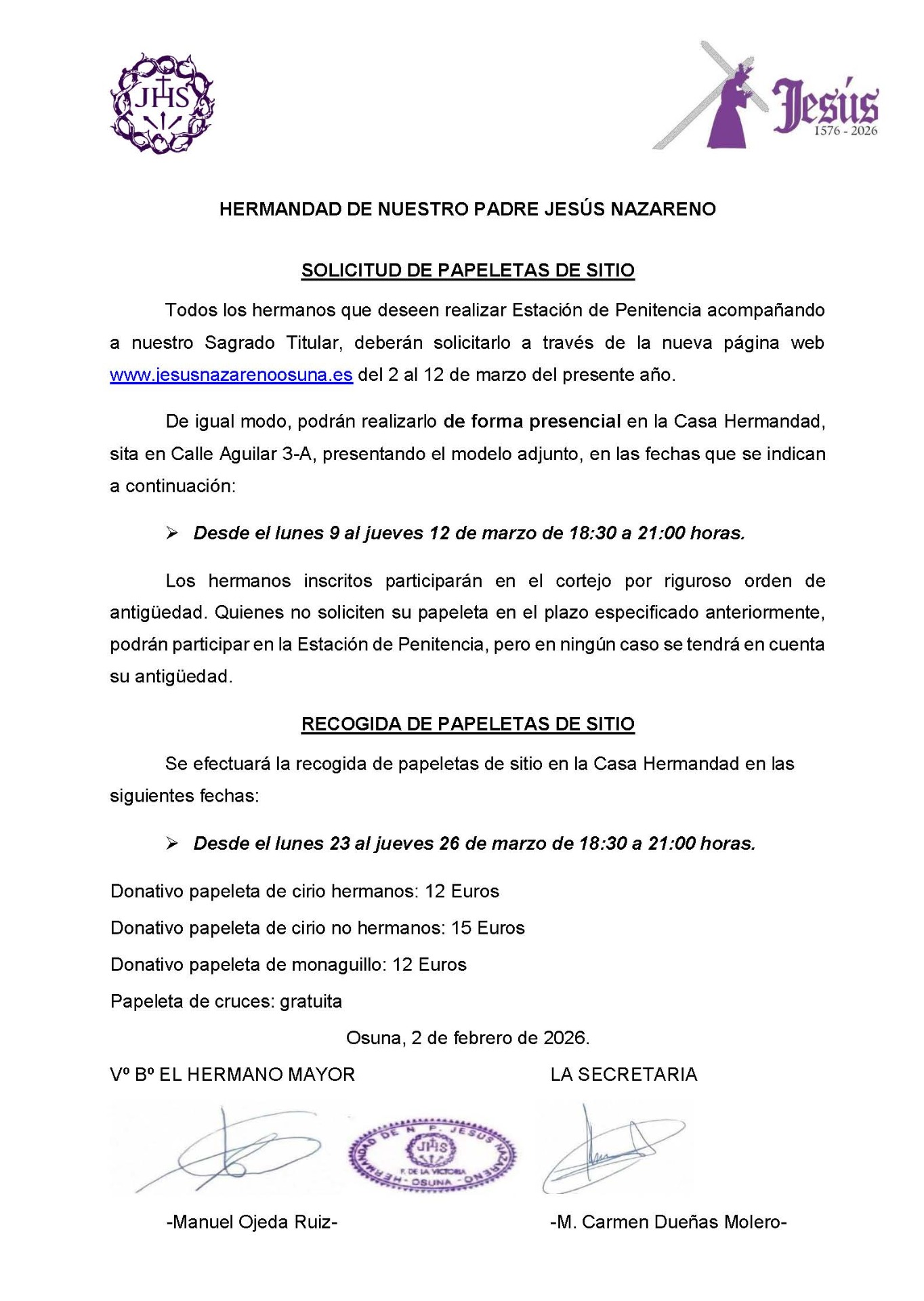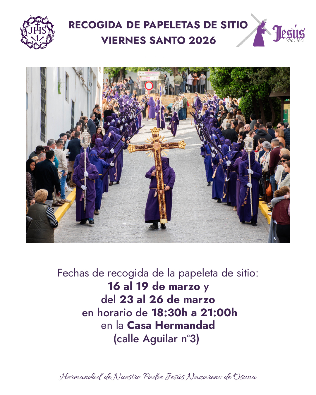 Se efectuará la recogida de papeletas de sitio en la Casa Hermandad en las siguientes fechas: